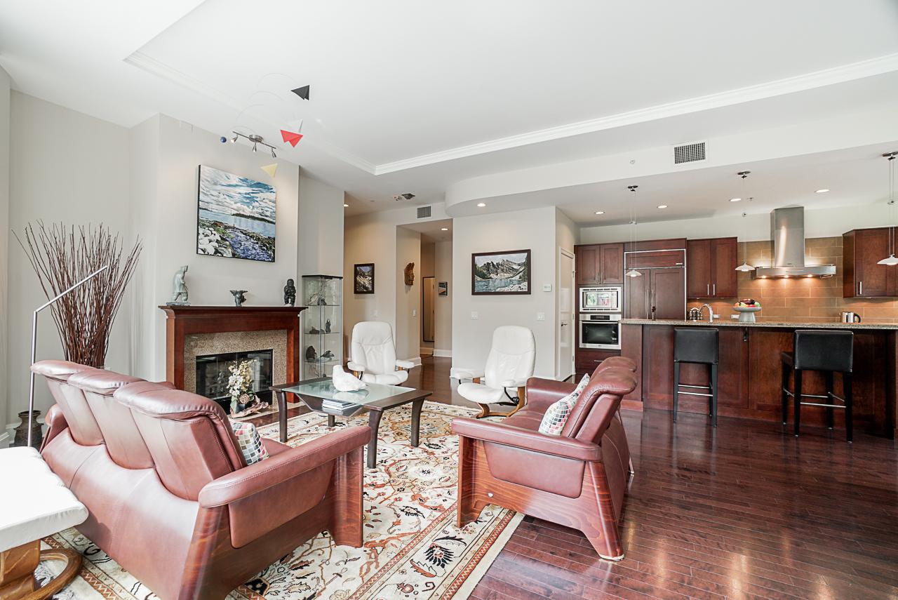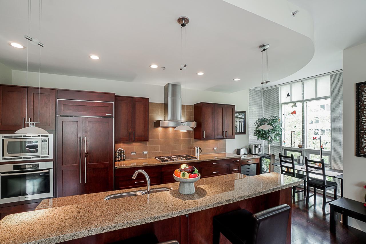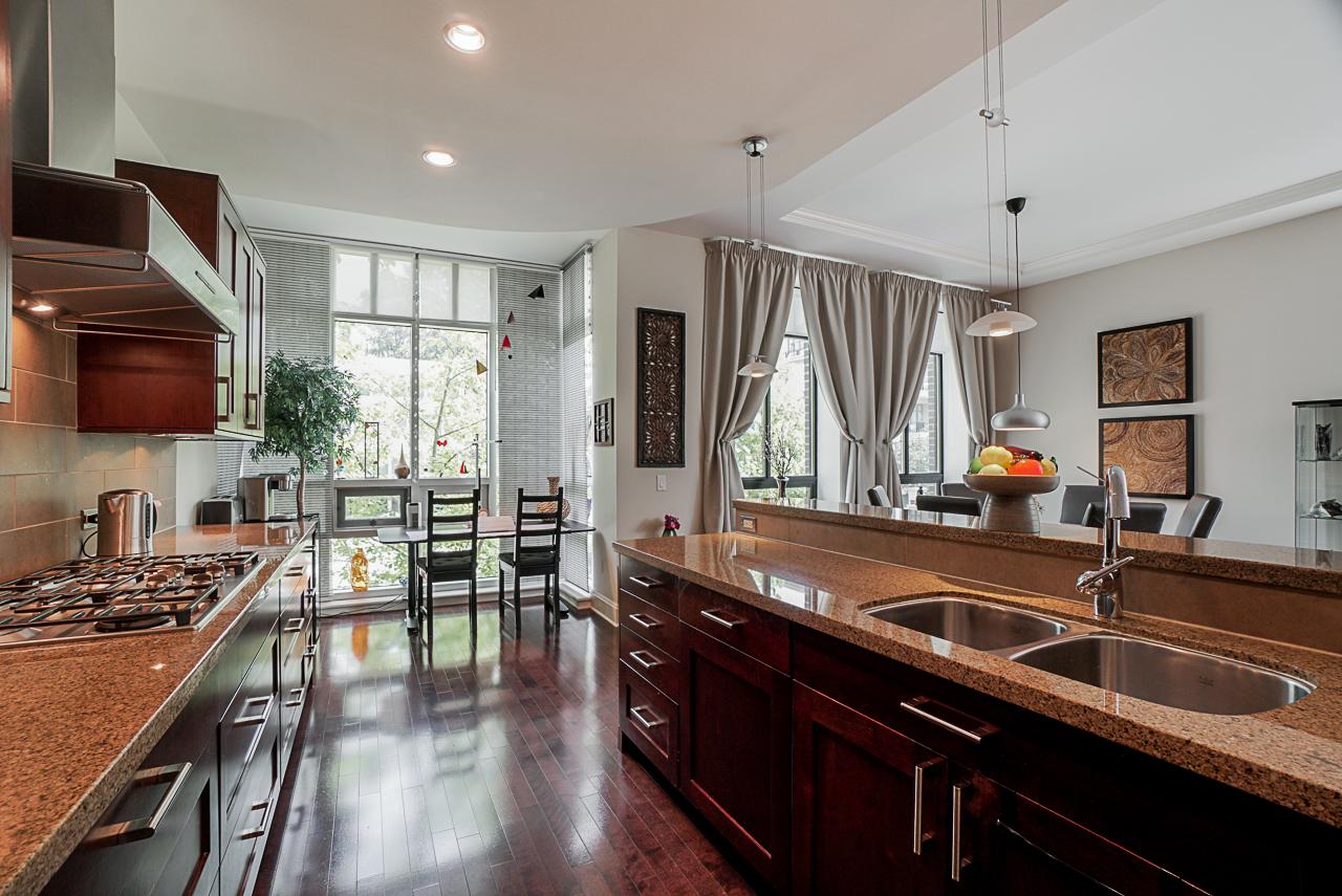 Experience the benefits of this superior spacious apartment, offering quality town and country living. This deluxe 1660 sq ft home has a grand open plan concept with high ceilings and hardwood floors, featuring floor to ceiling windows and in- floor radiant heat for winter comfort. During the hot summer months the air conditioning maintains a constant temperature, giving a perfect environment, just for you! The kitchen has granite counter tops and s/s Miele and sub-zero appliances. The two bedrooms each have generous sized en-suites. This friendly, four story, 13 apartment, adult-orientated building is located in a tree-lined, tranquil cul-de-sac, which leads to nearby trails, shops and restaurants. Underground large parking spot and storage locker is included. What more could you wish for!